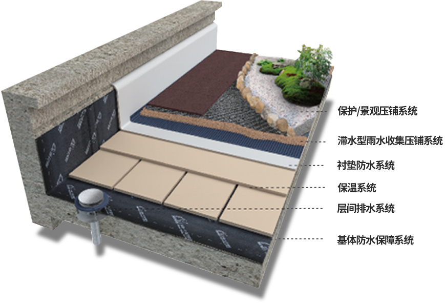 以最大程度的降低滲漏水概率、提高屋面系統(tǒng)使用壽命、維護(hù)結(jié)構(gòu)功能為基本出發(fā)點(diǎn)而開發(fā)設(shè)計(jì)的。宜頂工業(yè)化裝配式屋面系統(tǒng)根據(jù)屋面功能需求,設(shè)計(jì)包含了六大子系統(tǒng):基體防水保障系統(tǒng)、層間排水系統(tǒng)、保溫系統(tǒng)、襯墊防水系統(tǒng)、滯水型雨水收集壓鋪系統(tǒng)、保護(hù)/景觀壓鋪系統(tǒng)。各子系統(tǒng)依次施工、協(xié)同作用,確保屋面系統(tǒng)的持久安全。