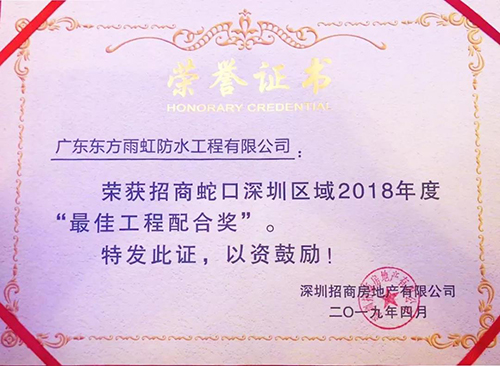 4月19日,“共筑大灣區(qū),精誠(chéng)贏未來(lái)——2019年招商蛇口深圳區(qū)域供應(yīng)商大會(huì)”在深圳召開(kāi)。東方雨虹憑借優(yōu)質(zhì)產(chǎn)品及高效服務(wù)榮獲招商蛇口深圳區(qū)域2018年度“最佳工程配合獎(jiǎng)”。
