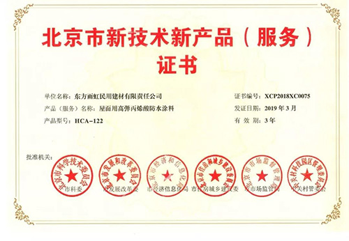 近日,雨虹防水自主研發(fā)生產(chǎn)的三款產(chǎn)品HCA-122屋面用高彈丙烯酸防水涂料、雨虹300自修復(fù)型防水涂料、L100靚縫劑獲得北京市科學(xué)技術(shù)委員會、北京市發(fā)展和改革委員會、北京市經(jīng)濟和信息化局、北京市住房和城鄉(xiāng)建設(shè)委員會、北京市市場監(jiān)督管理局、中關(guān)村科技園區(qū)管理委員會等聯(lián)合頒發(fā)的《北京市新技術(shù)新產(chǎn)品(服務(wù))證書》。