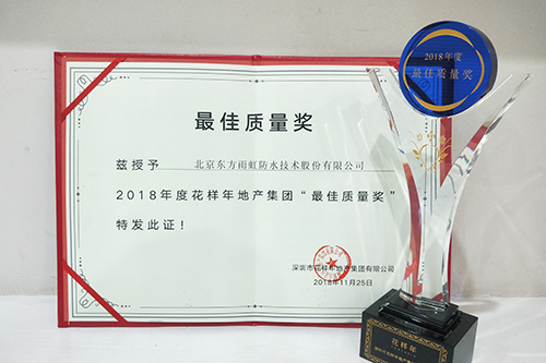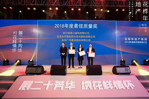 11月25日,以“展二十芳華、繡花樣情懷”為主題的花樣年地產(chǎn)集團2018年度供應商答謝大會在深圳舉辦。東方雨虹憑借優(yōu)質(zhì)的產(chǎn)品質(zhì)量、精湛的施工工藝以及完善的售后服務,榮獲花樣年地產(chǎn)集團2018年度“最佳質(zhì)量獎”。