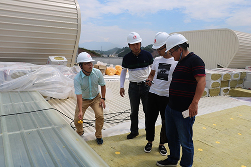 集團(tuán)TPO平臺(tái)技術(shù)工程師姜云飛為考察團(tuán)講解了TPO防水材料的發(fā)展、應(yīng)用領(lǐng)域、施工工藝及經(jīng)典案例,重點(diǎn)介紹了TPO防水材料在金屬屋面單層外露的施工工藝。在隨后的屋面TPO現(xiàn)場(chǎng)施工參觀中,考察團(tuán)也針對(duì)TPO細(xì)部節(jié)點(diǎn)施工問題提出疑問,工程師都一一予以解答。