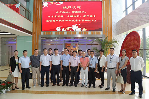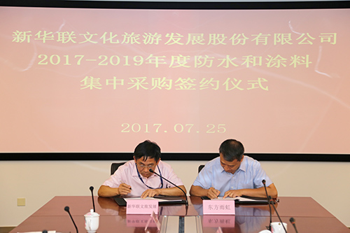 7月25日,新華聯文化旅游發(fā)展股份有限公司2017-2019年度防水和涂料集中采購簽約儀式在北京臺湖新華聯總部召開,包括東方雨虹在內的五家涂料和防水供應商代表受邀參加。新華聯集采中心總監(jiān)彭建奇主持儀式,東方雨虹集團副總裁張洪濤參加簽約儀式并發(fā)言。