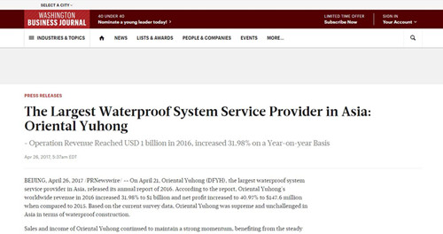 東方雨虹的市場表現(xiàn)都有著中國建筑防水領(lǐng)域風(fēng)向標(biāo)的作用。4月21日,東方雨虹發(fā)布2016年年報,據(jù)報告顯示,2016年東方雨虹實現(xiàn)營業(yè)總收入70億元,同比增長31.98%;凈利潤10.29億元,同比增長40.97%。如此靚麗的成績單一經(jīng)發(fā)布,受到了包括Yahoo!、Washington Business Journal、TheStreet、MarketWatch等200余家國際媒體的關(guān)注。