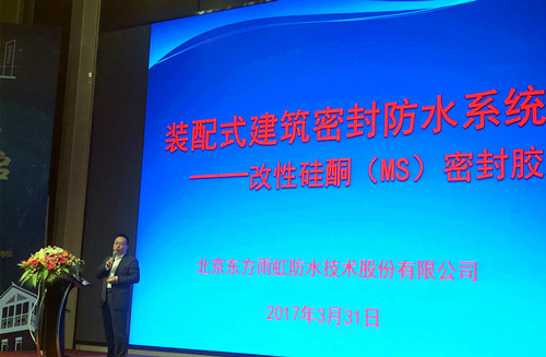 會上,朱衛(wèi)如作“裝配式建筑密封膠防水系統(tǒng)解決方案”主題報告,從裝配式建筑密封防水系統(tǒng)的開發(fā)背景和產品研制來源入手,針對裝配式建筑防水提供系統(tǒng)解決方案;詳細介紹了東方雨虹改性硅酮密封膠系列產品的產品性能、優(yōu)勢和施工工藝,其中包括建筑石材專用改性硅酮密封膠、PC建筑專用改性硅酮密封膠、門窗專用改性硅酮密封膠和防霉專用改性硅酮密封膠,這四款產品貼合裝配式建筑的特點,系統(tǒng)滿足了裝配式建筑密封防水的功能需求,尤其適用于裝配式建筑工程。