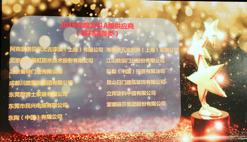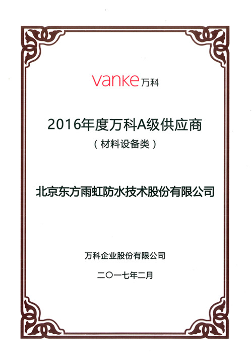 2月17日,萬科集團(tuán)2017年合作伙伴春茗會在深圳大梅沙萬科總部召開,東方雨虹防水集團(tuán)總裁劉斌、大客戶事業(yè)部總經(jīng)理陳欣剛參加了此次會議。會上,萬科對外發(fā)布了“2016年合格供應(yīng)商名錄”,在965家五大類合格供應(yīng)商中,東方雨虹等117家合作企業(yè)被評為“A級供應(yīng)商”。據(jù)悉,從2013年萬科開始發(fā)布該名錄起,這已是東方雨虹連續(xù)第四年榮獲此稱號。