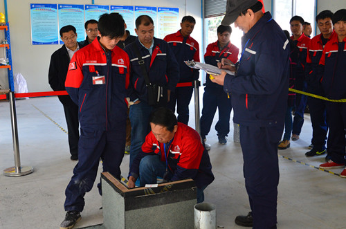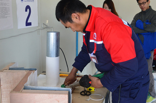 在緊張激烈的切磋技藝過(guò)程中,裁判員始終秉承公平公正原則,分別從施工時(shí)間、工藝標(biāo)準(zhǔn)、陰陽(yáng)角處理、管根做法、JSA攪拌、立面噴涂等主要節(jié)點(diǎn)來(lái)考核評(píng)比參賽選手對(duì)防水施工技術(shù)掌握情況。參賽選手們各顯其能,充分展現(xiàn)了過(guò)硬的技術(shù)本領(lǐng)和良好的精神風(fēng)貌,精湛的施工技術(shù)除了贏得在場(chǎng)參觀人員的一致好評(píng),還吸引了城建學(xué)院的領(lǐng)導(dǎo)和師生前來(lái)觀摩學(xué)習(xí)。