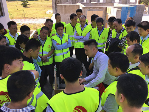 參觀過后,雨虹技術培訓講師周王喜就界面劑的使用,墻地面防水,陰陽角、管根等細部節(jié)點處理等內容對參觀組進行了詳細的培訓講解,并針對系統(tǒng)防水施工工法進行實操演示,從細部處理到大面涂刷一一詳細演示、解說。隨后,大家齊聚會議室,雨虹技術培訓講師蒙日金就墻地面防水、界面劑、瓷磚薄貼法等雨虹產(chǎn)品應用理論進行悉心講解。