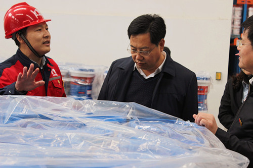 馬希良參觀了卷材車間、卷材庫房和涂料車間,并對(duì)東方雨虹先進(jìn)的設(shè)備、優(yōu)質(zhì)的產(chǎn)品和高科技的倉儲(chǔ)管理系統(tǒng)給予了高度的贊許和肯定。魯家華為考察團(tuán)介紹了咸陽生產(chǎn)基地具體情況,尤其是年產(chǎn)能2000萬平米的先進(jìn)卷材生產(chǎn)線:引進(jìn)自意大利BOATO的多功能防水卷材生產(chǎn)線和美國R&D公司的3000型防水卷材生產(chǎn)線。作為全球化的防水系統(tǒng)服務(wù)商,東方雨虹的生產(chǎn)基地正在向高科技全智能化企業(yè)發(fā)展。