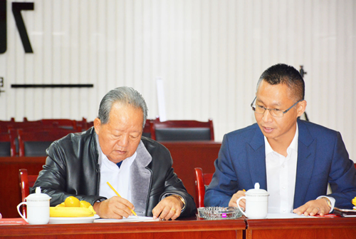 老撾原中央政治局常委、副總理阿?!诶铮ㄗ螅?、風行防水總經(jīng)理呂學強(右)