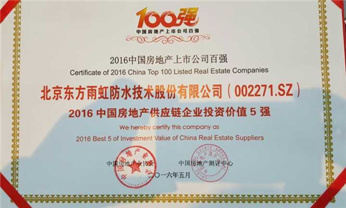 5月26日,由中國房地產(chǎn)業(yè)協(xié)會(huì)、中國房地產(chǎn)測評中心聯(lián)合開展的“2016中國房地產(chǎn)上市公司測評成果發(fā)布會(huì)暨上市房企高峰論壇”在香港盛大舉行,《2016中國房地產(chǎn)上市公司測評研究報(bào)告》等測評研究成果火熱出爐。東方雨虹獲評“2016中國房地產(chǎn)供應(yīng)鏈上市公司投資價(jià)值5強(qiáng)”。