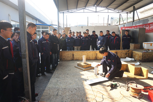 下午,《單程防水卷材屋面工程技術(shù)規(guī)程》及《TPO事業(yè)部施工流程梳理及材料管理》的宣貫,讓與會(huì)人員明確掌握了工程技術(shù)及施工過程中的規(guī)章制度,項(xiàng)目經(jīng)理組和工人代表組也就項(xiàng)目管理的經(jīng)驗(yàn)與施工技術(shù)作了分享,新同事們?nèi)绔@至寶,現(xiàn)場(chǎng)提問、討論同步進(jìn)行。 頒獎(jiǎng)環(huán)節(jié),現(xiàn)場(chǎng)為TPO事業(yè)部?jī)?yōu)秀項(xiàng)目經(jīng)理王海東、崔巖,優(yōu)秀施工班組張廣志,優(yōu)秀施工員李冰,優(yōu)秀新人鐘魚,優(yōu)秀施工隊(duì)長(zhǎng)高明坤等人頒發(fā)獎(jiǎng)勵(lì)及證書。 本次培訓(xùn)還組織TPO細(xì)部節(jié)點(diǎn)實(shí)操大賽,由2015中國(guó)屋面防水大師徐龍瀟現(xiàn)場(chǎng)演示陰陽角和管根的標(biāo)準(zhǔn)化施工實(shí)操及講解。TPO事業(yè)部的所有施工管理人員及班組組長(zhǎng)聚精會(huì)神觀看,精益求精的施工工法引來陣陣驚嘆。