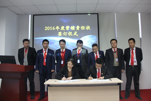 在對華砂2015年度優(yōu)秀員工及優(yōu)秀經(jīng)理人頒獎表彰后,華砂商務(wù)總監(jiān)王曉峰先生上臺同張穎女士簽訂2016年營銷責(zé)任狀。