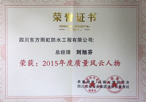 1月23日,由四川日報報業(yè)集團和活動組委會聯(lián)合主辦的“質(zhì)量榜樣·傳媒大獎”頒獎盛會隆重舉行。四川東方雨虹防水工程有限公司總經(jīng)理劉旭芬榮獲四川省2015年度質(zhì)量風云人物獎。