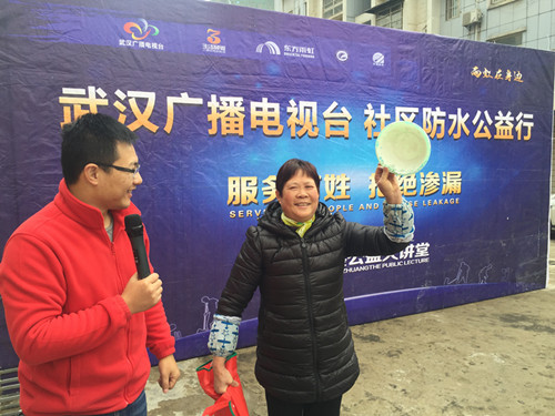 2015年12月6日,“服務百姓 拒絕滲漏”公益大講堂在武漢的最后一場活動在硚口區(qū)百姓之春社區(qū)開講,近兩百名業(yè)主參與了本次活動。 2015年,東方雨虹聯(lián)合武漢廣播電視臺在武漢十大社區(qū)開展服務百姓拒絕滲漏活動,累計服務人群達4000余人,滲漏診治63戶,免費維修名額十戶。活動共斥資數(shù)十萬,旨在改善百姓居住環(huán)境,降低房屋滲漏情況,和諧鄰里關系。 活動當天,武漢高級區(qū)域經(jīng)理鐘濤鋒為百姓提供了專業(yè)實用的家裝防水知識以及防水滲漏診治方法的講解,并對如何識別防水材料真?zhèn)?、滲漏發(fā)生后的緊急救援措施進行了科普。他專業(yè)通俗的講解方法,讓老百姓在最短的時間獲得了豐富的防水知識,得到全場觀眾的一致好評。