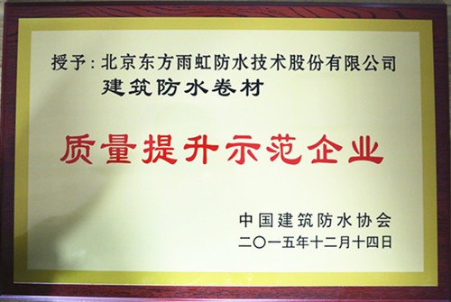 12月14日,中國(guó)建筑防水協(xié)會(huì)第七次會(huì)員大會(huì)暨“全國(guó)建筑防水行業(yè)質(zhì)量提升大會(huì)”在京舉行。北京東方雨虹防水技術(shù)股份有限公司在會(huì)上被評(píng)為“質(zhì)量提升示范企業(yè)”。 2015年9月,在國(guó)家質(zhì)檢總局的指導(dǎo)下,由中國(guó)建筑防水協(xié)會(huì)聯(lián)合地方防水社團(tuán)組織及骨干企業(yè)開(kāi)展的建筑防水行業(yè)“質(zhì)量提升萬(wàn)里行”活動(dòng)啟動(dòng),東方雨虹作為“建筑防水行業(yè)質(zhì)量萬(wàn)里行”典型單位,在會(huì)上被授予“質(zhì)量提升示范企業(yè)”稱號(hào)。