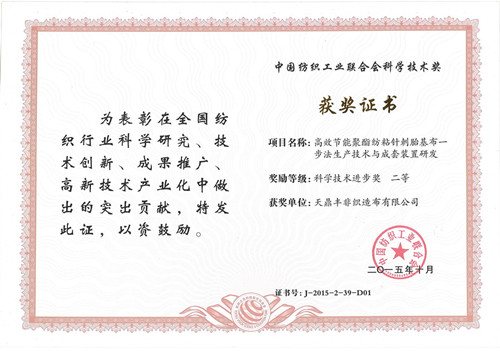 11月24日,“紡織之光”2015年度中國紡織工業(yè)聯(lián)合會科技教育獎勵大會在北京人民大會堂隆重舉行。會上天鼎豐非織造布有限公司的《高效節(jié)能聚酯紡粘針刺胎基布一步法生產(chǎn)技術與成套裝置研發(fā)》項目榮獲“紡織之光”2015年中國紡織工業(yè)聯(lián)合會科技技術進步獎二等獎。