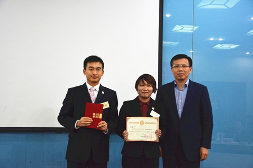 東方雨虹總裁向錦明為本屆優(yōu)秀學(xué)員單良、于霞頒發(fā)證書