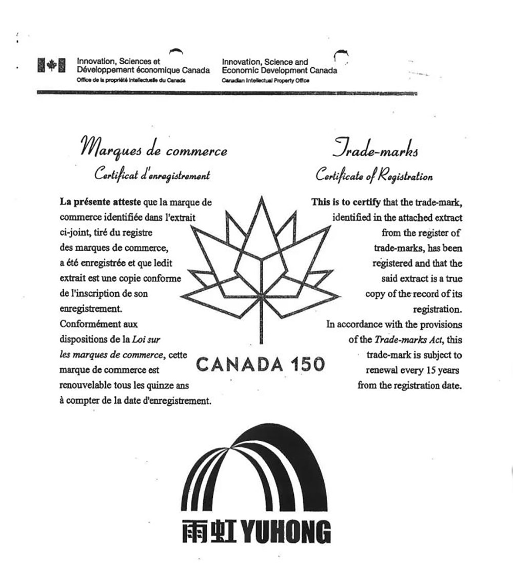 日前,公司收到由隸屬加拿大創(chuàng)新、科技及經濟發(fā)展部(Innovation, Science and Economic Development Canada)的加拿大知識產權局(Canadian Intellectual Property Office)頒發(fā)的“雨虹”加拿大商標注冊證書,其商標保護范圍覆蓋瓷磚膠、涂料、砂漿、防水卷材、建筑工程服務等公司主營業(yè)務的全部品類。