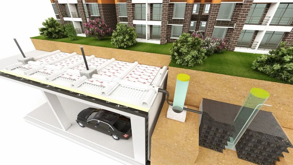 桃花源系統(tǒng)具有防水阻根、零度找坡、海綿理念等三大特點。不僅為建筑結(jié)構(gòu)提供持久可靠的柔性保護,還能通過蓄水模塊將雨水收集再利用,滿足節(jié)水和水資源利用要求,符合綠色建筑和海綿城市建設(shè)要求。