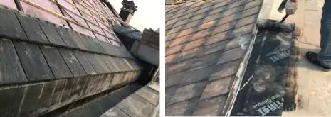7)掛瓦條釘好之后,由下至上逐層恢復(fù)掛瓦,最頂層瓦片恢復(fù)后,用鋁板包住,并鋪貼防水卷材,與平面基層做好搭接,最終將屋面清理干凈。