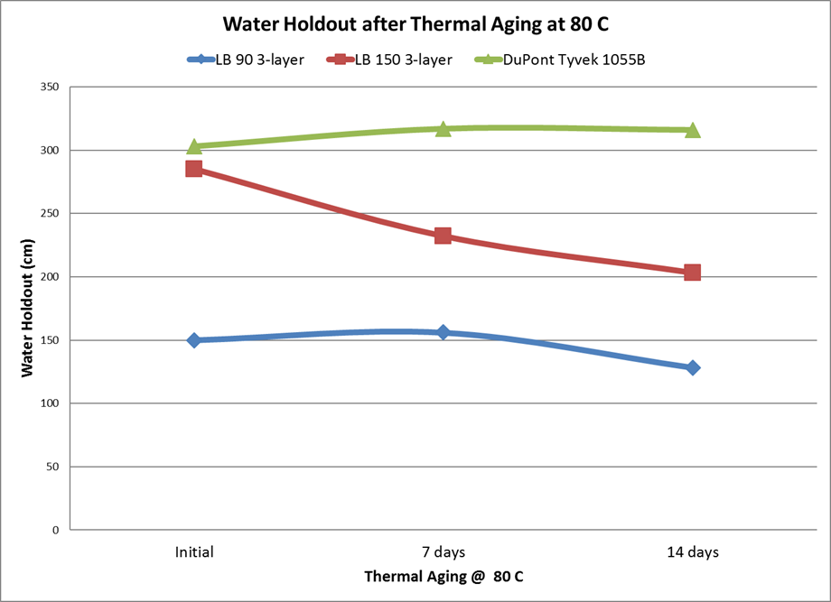 (80℃熱老化后的耐水柱高度,綠色為特衛(wèi)強(qiáng)1055B,紅色和藍(lán)色為三層復(fù)合構(gòu)造產(chǎn)品)