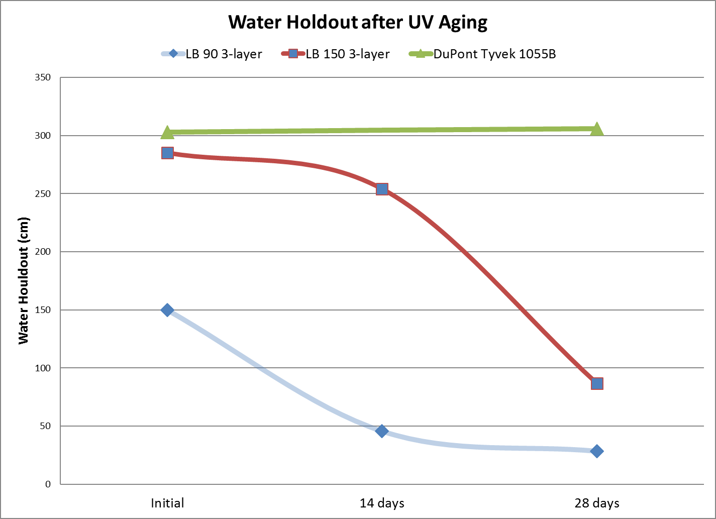 (UV老化后的耐水柱高度,綠色為特衛(wèi)強(qiáng)1055B,紅色和藍(lán)色為三層復(fù)合構(gòu)造產(chǎn)品)