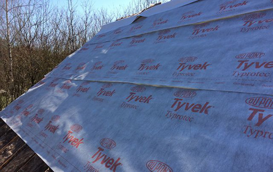 屋面翻新第二步:鋪設特衛(wèi)強®加強型透汽膜(拼縫處使用特衛(wèi)強®膠帶密封以保證屋面系統(tǒng)的氣密性,防止熱量損失。)