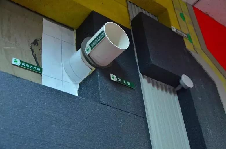 氣密性處理:門(mén)窗洞口、穿墻管道內(nèi)側(cè)應(yīng)粘貼防水隔汽膜,外側(cè)應(yīng)粘貼防水透汽膜。保證室內(nèi)水汽不能進(jìn)入保溫系統(tǒng)的同時(shí),還能使得保溫系統(tǒng)內(nèi)一旦聚積水汽可以及時(shí)排出。