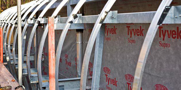 由于高節(jié)能的設(shè)計(jì)要求,該項(xiàng)目采用了特衛(wèi)強(qiáng)®加強(qiáng)型透汽膜和AirGuard®隔汽膜產(chǎn)品系統(tǒng)。特衛(wèi)強(qiáng)®加強(qiáng)型透汽膜安裝在外墻的背部用來(lái)密封外部的檐口部位,AirGuard®隔汽膜安裝在隔熱鋼架和維護(hù)系統(tǒng)的內(nèi)襯之間,安裝在第二道鋼結(jié)構(gòu)和鋁制擋雨屏后面的特衛(wèi)強(qiáng)®加強(qiáng)型透汽膜作為氣密材料可以提供良好的防風(fēng)、抗撕裂和透汽性能,而AirGuard®隔汽膜可進(jìn)一步加強(qiáng)該系統(tǒng)的隔汽性能和氣密性能。