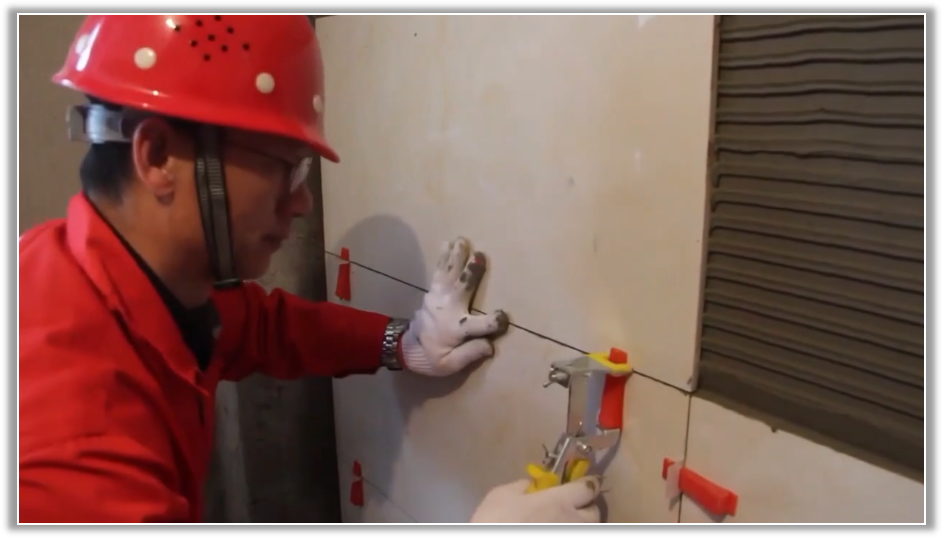 用鉗子固定找平器楔子并用靠尺檢查是否鋪貼平整