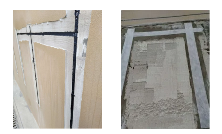 2. 鏟除裂縫兩側(cè)外墻涂料、膩?zhàn)蛹氨橐褐凛p質(zhì)混凝土板。