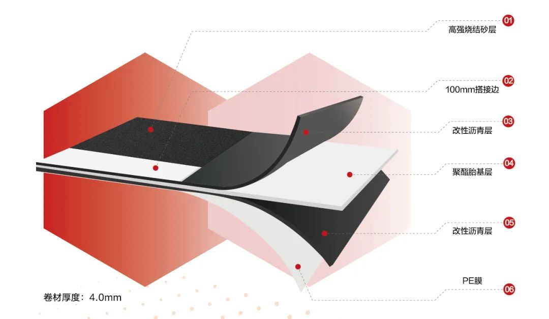 此外,卷材可與東方雨虹TZH特種非固化橡膠瀝青防水涂料/太空堡SBS改性瀝青防水卷材/PMB-741等配套使用,滿足更高防水等級設(shè)防要求。