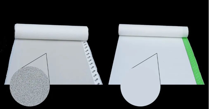 左:BSP砂面背粘型高分子自粘膠膜防水卷材右:JY89非砂面背粘型高分子自粘膠膜防水卷材